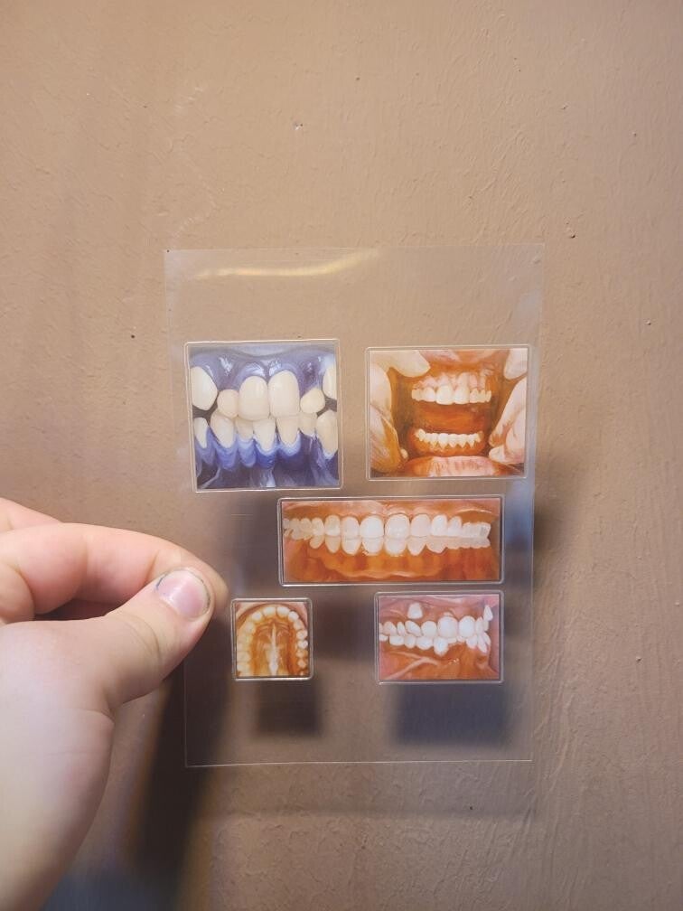 Transparent 10 x 13 cm sticker sheet with 5 different stickers.